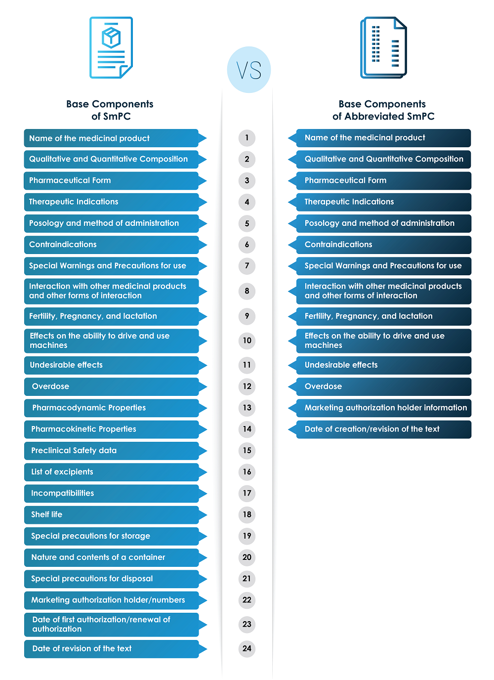 Abbreviated SmPC should contain an important note/mandatory statement at the top of the document, quoting, “Before prescribing, consult/refer to the full prescribing information.” The nomenclature could vary between Reduced PI, Basic Succinct Statement (BSS) document, and Abbreviated SmPCs from company to company. It also helps in defending legal cases arising due to promotional material. The following picture represents the components of both the SmPC and the Abbreviated SmPC.