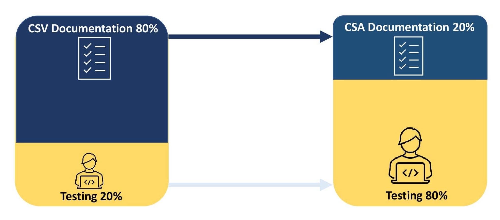 The main objective is to focus on validating and documenting safety-risk activities based on software complexity. Such an approach encourages the usage of digitization and automation, thereby improving product quality. The reduction in the documentation process helps organizations react to critical software issues and comply with the health authority guidance. CSA leverages the vendor quality systems for unscripted testing for validating low-risk systems allowing organizations to invest their 80% efforts into testing and 20% effort into documentation.