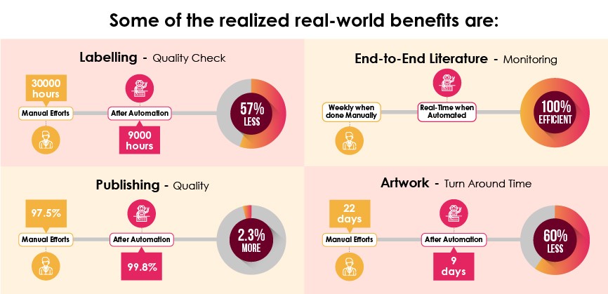 With AI, ML, NLP, and other automation tools, companies can improve efficiency, enhance productivity, ensure safe drugs and devices, hasten market entry, and remain in those markets, ultimately driving better business outcomes.