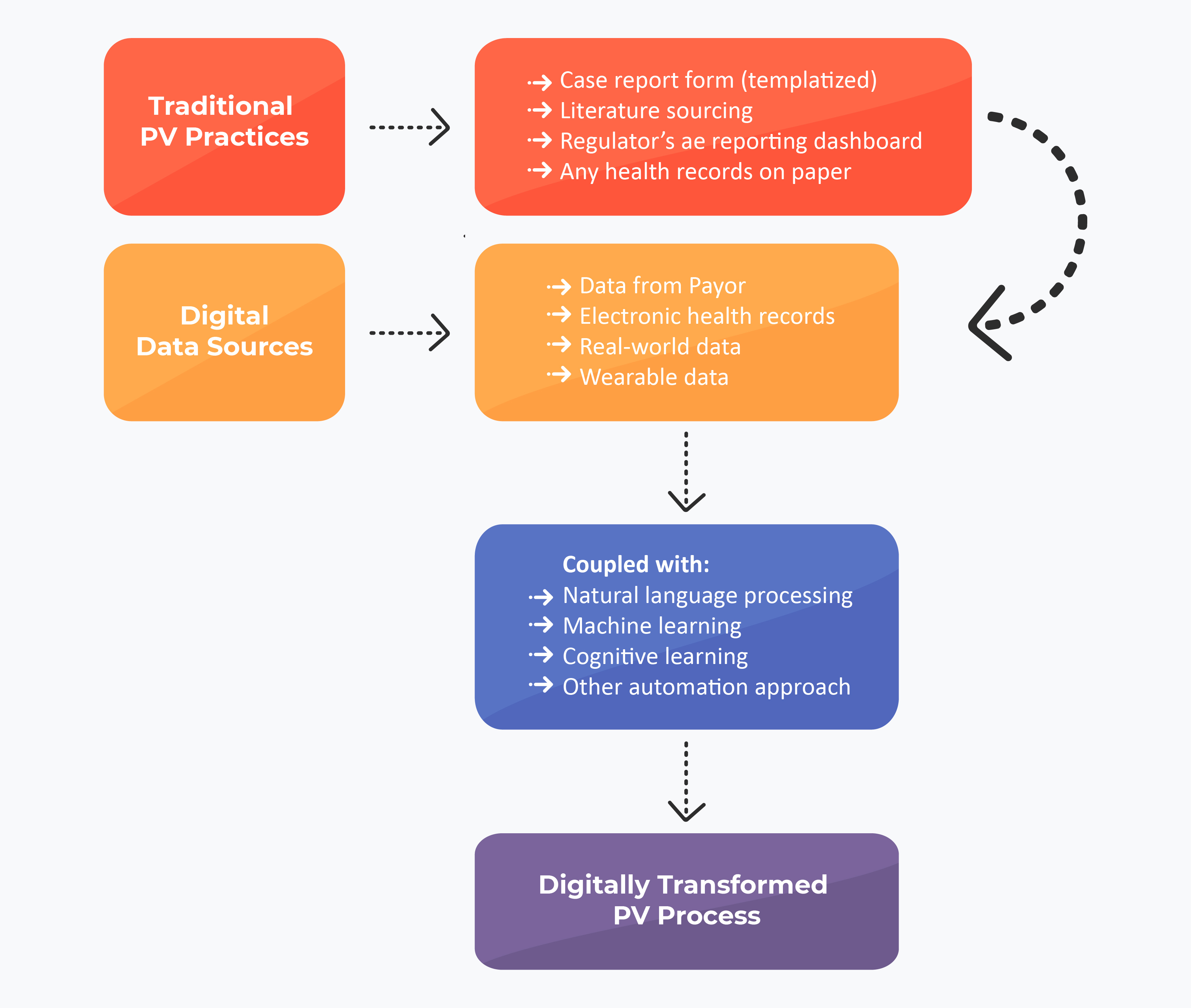 As many of the PV operations revolve around case processing, aggregate reporting, and signal detection, many digital PV operations propose an ‘Overlap approach.’ This approach mainly works on the machine learning (ML) model and drives the data on the information which is collected, analyzed, and processed in either of the three operations. The second approach is phase-wise learning and experimenting with various tools until bringing to function for operations.