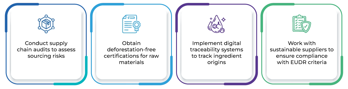 - Companies must prove that raw materials (e.g., palm oil-based surfactants, glycerin, and rubber-derived ingredients) are not linked to deforestation.
