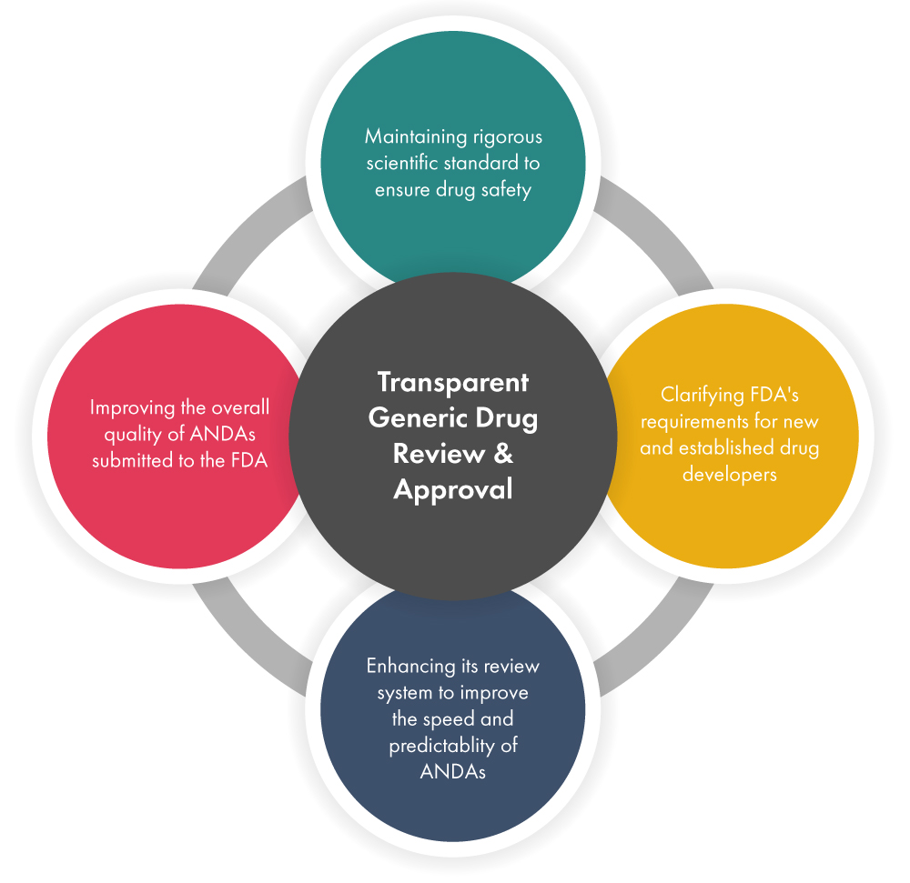 Enhance the generic drug development efficiency while hastening the review and approval process – The FDA is taking several initiatives to ensure that the generic drug’s review and approval process meets all the safety standards before bringing them to the market faster. Below is a representation of how this is done.