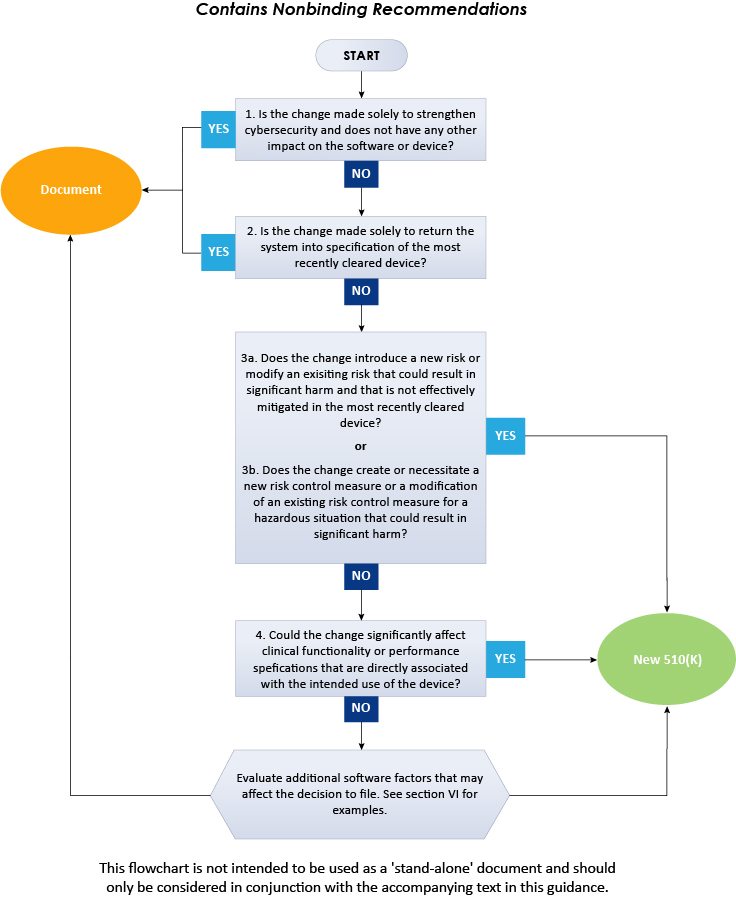The above flowchart illustrates a step-by-step procedure to be followed to decide on 510(k) submission for software changes in existing devices. In conclusion, the present FDA guidance describes in detail the approach to be followed by the medical device manufacturers when deciding whether the software changes to an existing medical device require submission of a new 510(k). To gain further insights on the FDA guidance, consult Freyr - a proven Regulatory expert. Stay informed. Stay compliant.