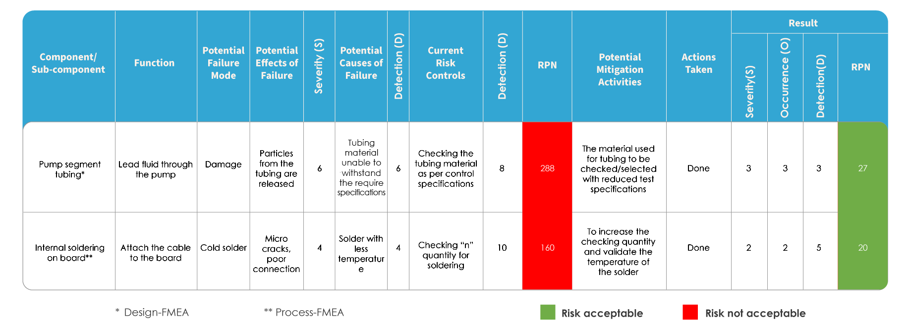 There are two types of FMEAs: Design FMEA (DFMEA) and Process FMEA (PFMEA). In the context of medical devices, device manufacturers use DFMEA to evaluate failures concerning device design and specifications, whereas PFMEA is used to improve the manufacturing process.