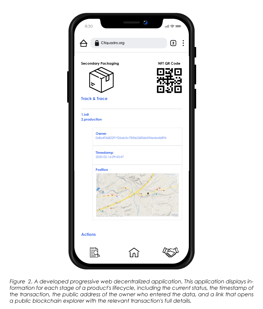 The traceability procedure that is discussed herein (Figure 1) gives the final customer an effective instrument for verifying the product's history and determining if it is in the right condition to be sold. The transparency of the blockchain throughout the entire production and distribution process enables all users to examine the status of each item by scanning the QR code with a Web3 application (Figure 2). This makes it possible to prevent and stop attempts at counterfeiting. Thus, the user who is receiving the package will be able to check the NFT's status and confirm the latest, even within the product distribution cycle, and whether the status of the movement was updated rightfully.