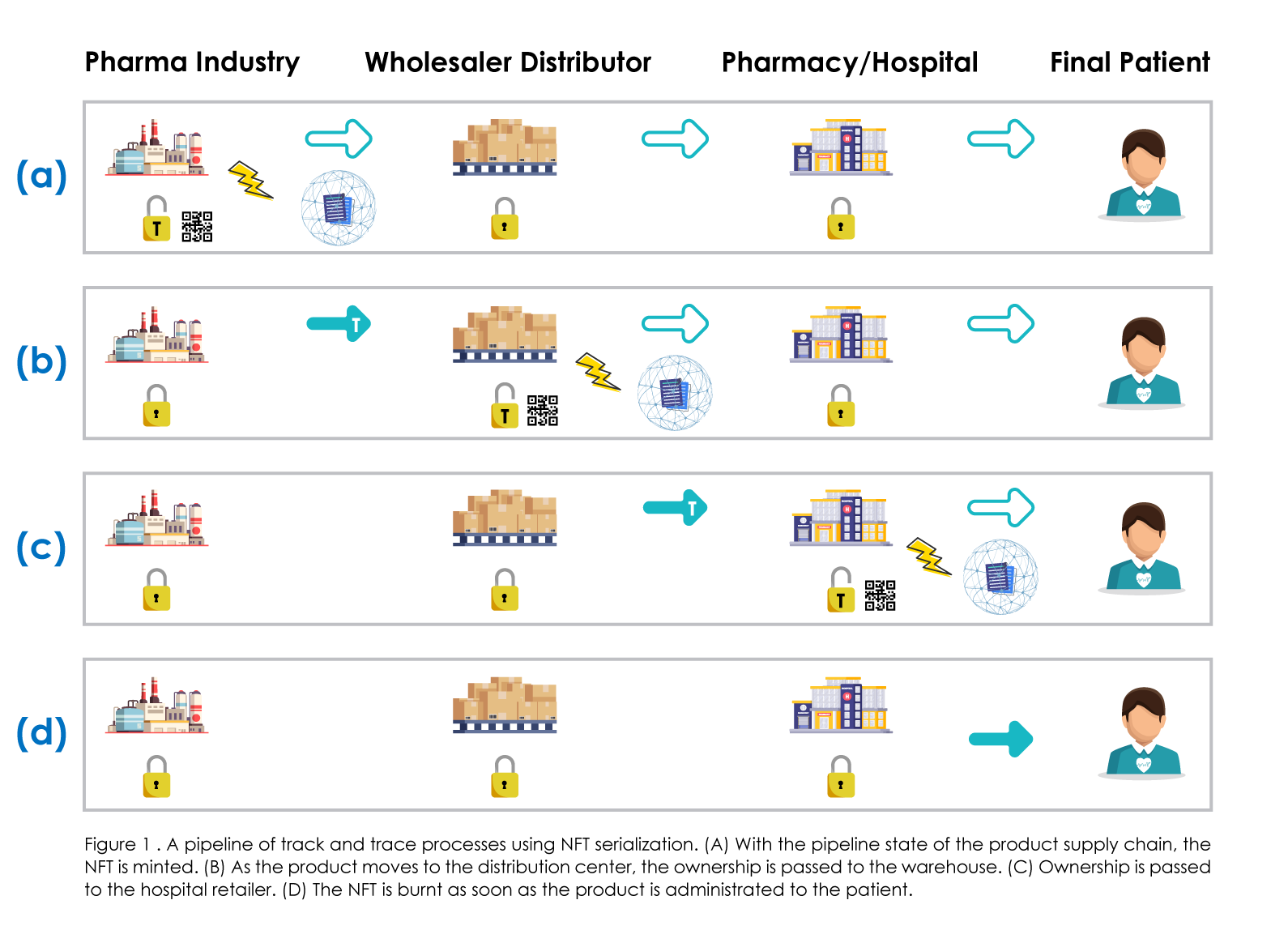 Although, a second item must be included in the equation to complete a successful blockchain-based traceability solution. An NFT acts as a token that provides the confirmation of product identification and assigns ownership to the user. Once the medicinal product is manufactured and is ready to move from the manufacturing site to the pharmaceutical factory, an NFT event must update the owner with the rightful details to pass the ownership token to the wholesale distributor. This also indicates that the manufacturer must modify the new owner’s public address of the NFT for the package. Once the wholesale distributor receives the package, a new event called ‘delivered’ is initiated within the blockchain, along with additional details about the product’s state. After the confirmation, the wholesaler initiates the token take over to the next user (the hospital or the pharmacy), which now acts as the last distributor, which must update the information about the received package in the system and guarantee that the product can be administered (or sold) to the patient. After the patient receives the product, the NFT is erased by transferring ownership to an unreachable address, preventing anybody else from ever changing the NFT data. A described supply chain can be seen in figure 1.