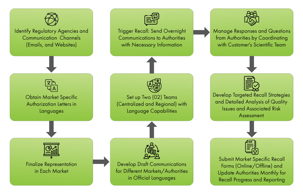 Freyr offers comprehensive product recall services, addressing various challenges involved in establishing and implementing tailored recall strategies, preparing documentation, and communicating with relevant Health Authorities (HAs) across different countries. Freyr also assists in handling public communications on behalf of the companies. Our team of crisis communication specialists stands ready to provide expert guidance, ensuring efficient management and effective mitigation of any recall situation. Don't hesitate to reach out for expert assistance.