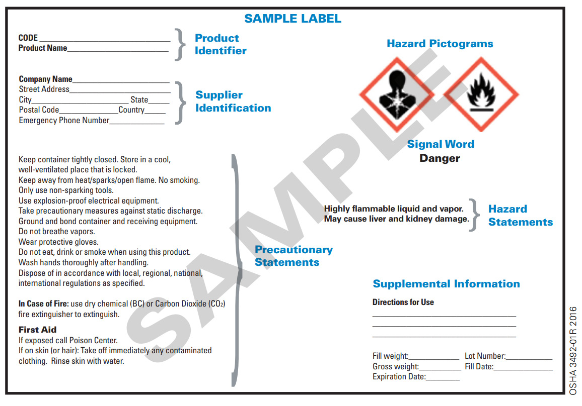 - Supplemental Information: Directions for Use, Full Weight, Lot Number, Gross Weight, Fill Date, Expiration Date