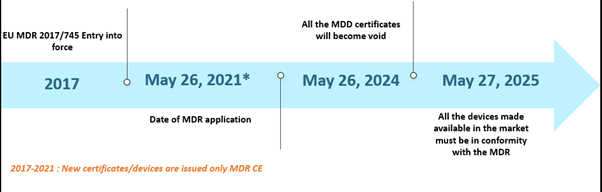 The European Union's (EU) Medical Device Regulation (MDR) has been making news for a while now. The MDR has replaced the Medical Device Directive (MDD) and Active Implantable Device Directive (AIMDD). Initially, the entire transition was set out to be in complete effect by May 2020; however, due to the emergence of the COVID-19 pandemic, the implementation was pushed further to May 26, 2021. In this timeline, by May 26, 2024, all the MDD certificates will become void, and the device manufacturers will be required to conform with the EU MDR. Further, the MDD devices lawfully placed on the market pursuant to Directives 90/385/EEC and 93/42/EEC prior to May 26, 2020, and devices placed on the market from May 26, 2020, by virtue of a certificate will continue to be made available in the market until May 27, 2025. The timelines are depicted below –