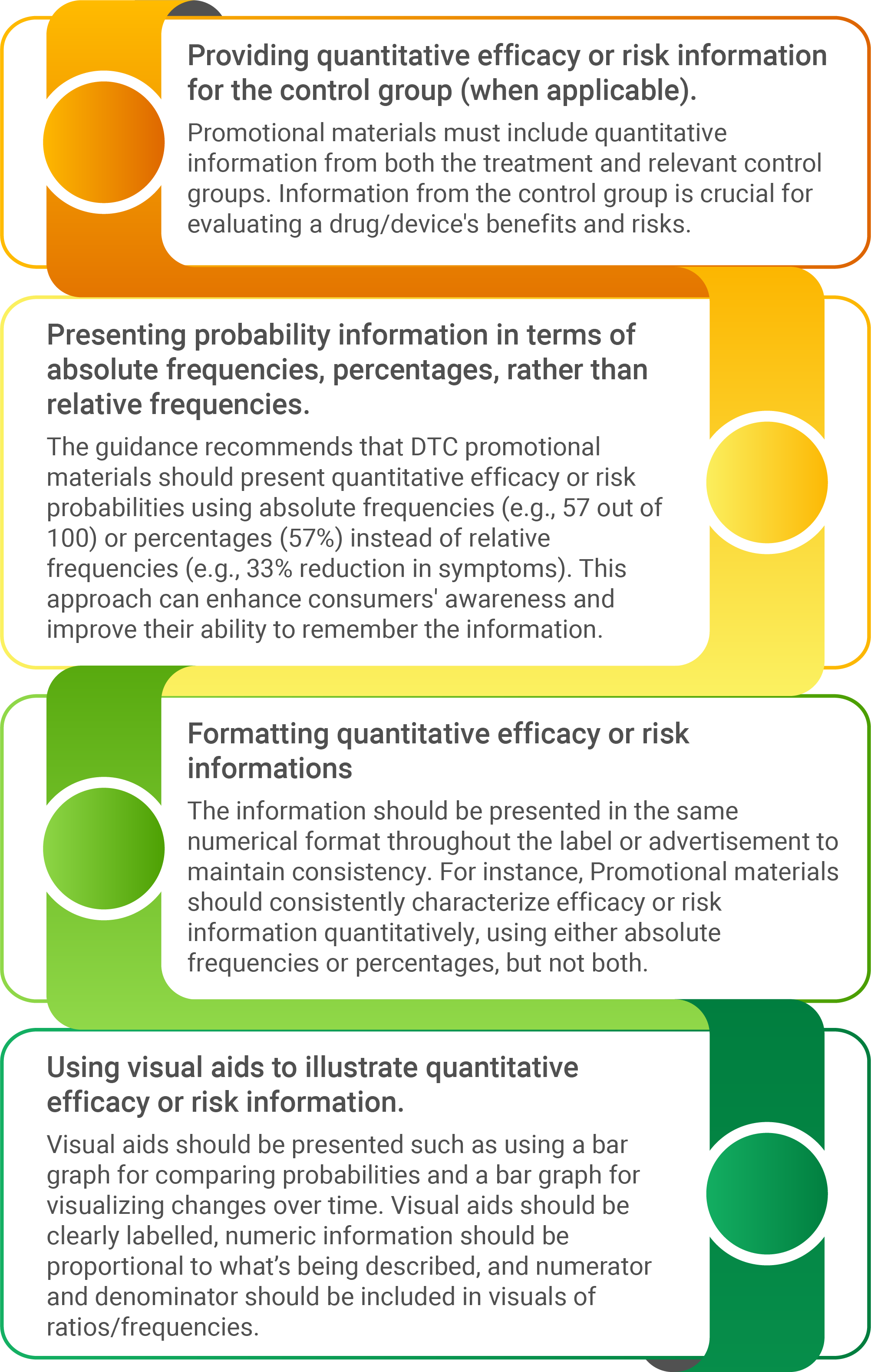 Keeping this new development in consumers’ thoughtfulness and digitalization; the FDA has released a recent guideline on “Presenting Quantitative Efficacy and Risk Information in Direct-to-Consumer (DTC) Promotional Labelling and Advertisements." The guidance offers a valuable recommendation on DTC advertisements presenting efficacy and risk information in quantitative terms.