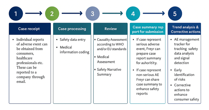 End to end case processing (Intake, classification, Cosmetic Safety Data Collection, causality assessment, case narrative preparation, medical review, and serious Cosmetic adverse event reporting to authority).