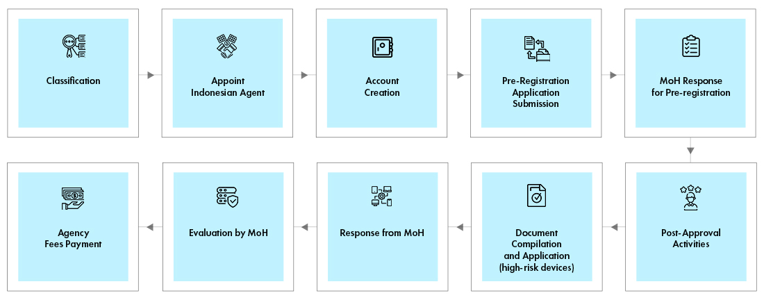 Indonesia has initiated universal health care for their citizens in 2014. This has greatly influenced the growth of Medical Devices market and led to the rise in the Medical Devices import. The devices in Indonesia are regulated by the National Agency of Drug and Food Control (NADFC) functioning under the Indonesian Ministry of Health (MoH). The latest regulation in place for import of Medical Devices is Decree No. 62 imposed in the year 2017. Foreign companies must appoint an Indonesia Local authorised representative for the process of Medical Device Registration in Indonesia.