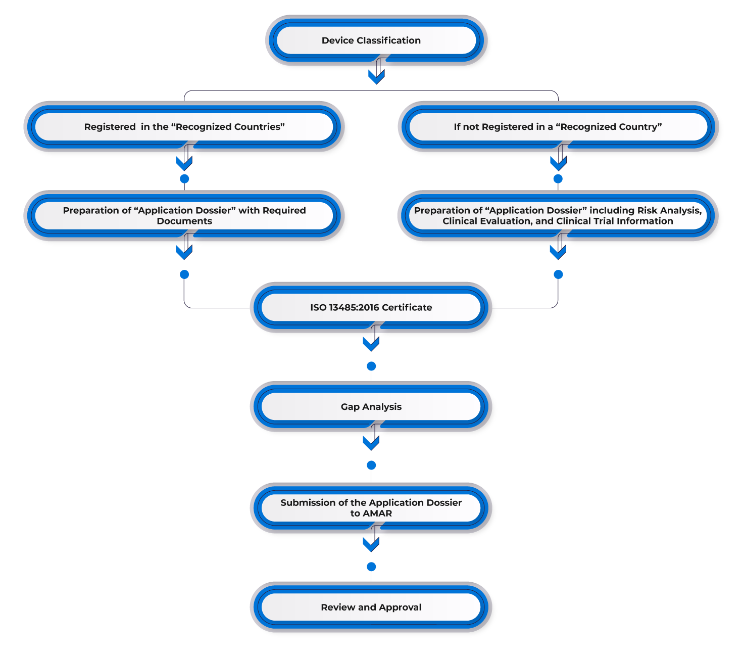 - Class II devices, while declarations and technical documents are necessary, AMAR may expedite the process to fourteen (14) days for those deemed low-medium risk. This applies if the manufacturer holds two (02) authorizations from recognized countries and provides six (06) months of market data. Alternatively, for Class II devices with only the US FDA 510(k) clearance and six (06) months of the US market data, AMAR processing time is accelerated to sixty (60) days.